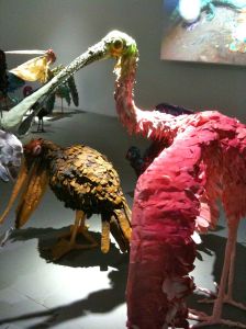 The Parade is Nathalie Djurberg’s collaboration with musician Hans Berg, which fills the space at Studio 231 (to the right of the museum’s main entrance). As you poke and pick your way among the feathered flock (actually painted canvas, wire, and other assembled materials), you may feel a little unsettled. Then you’ll notice several video screens on the walls in which the animated people and creatures do, well….not so nice things.