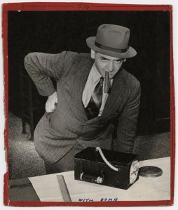 The show occupies most of the International Center of Photography’s lower level, and is filled with a recreation of Weegee’s room, his camera equipment, flash bulbs, press passes, and terrific interactive displays that bring you closer to one New York’s great documentarians of the Thirties and Forties. There’s even a set of photos of a gangster rub-out alongside the actual police crime ledger that documents what happened in Little Italy that night.