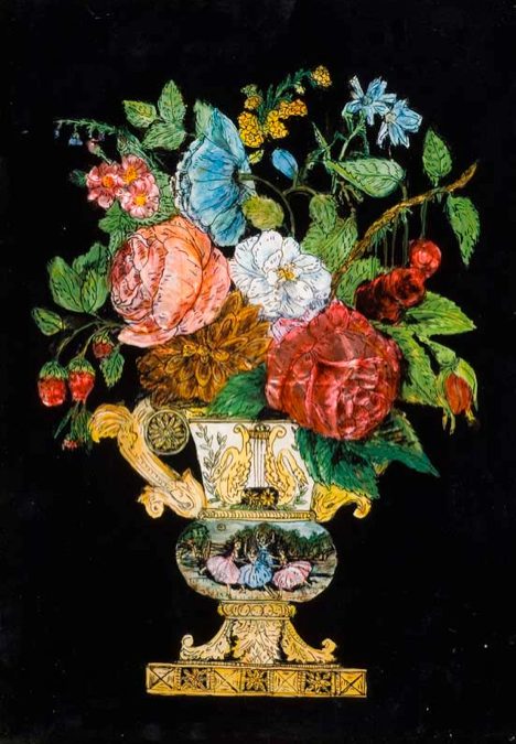 Alice Knight’s Urn of Flowers with Scene from Ballet Swan Lake. Reverse painting and foil on glass, c. 1940. Source: AFAM, gift of Susan and Laurence Lerner.