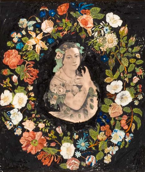 Artist unknown. Wreath of Flowers with Lithograph of Jenny Lind. Reverse painting and foil on glass with lithograph, c. 1850. Source: AFAM, gift of Susan and Laurence Lerner.