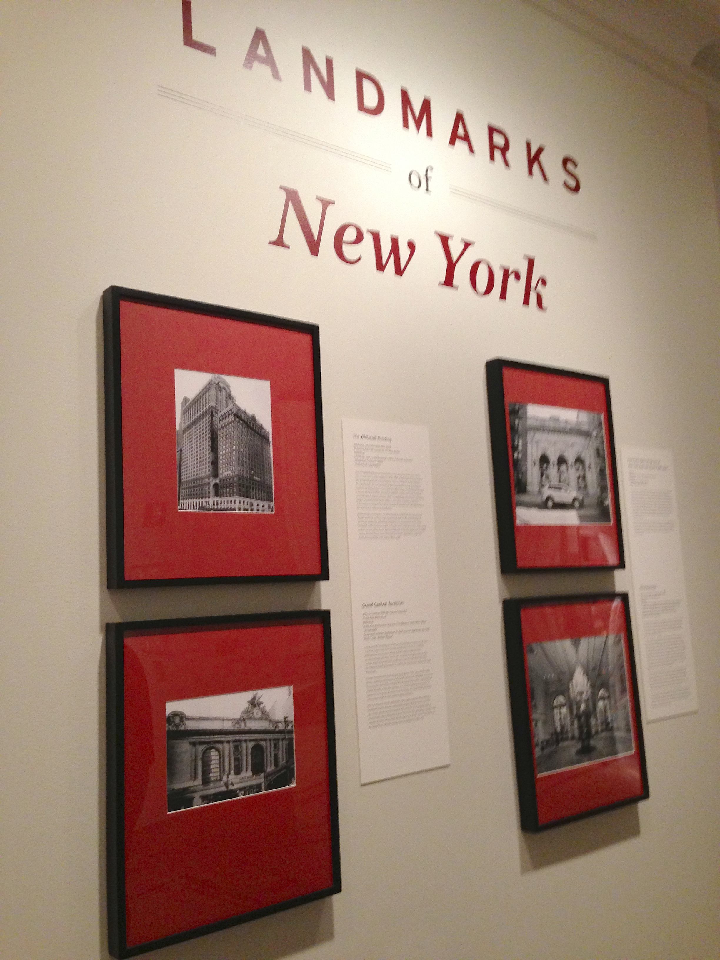 Installation view featuring photos of the Whitehall Building (17 Battery Place), Grand Central Terminal, the Free Public Baths (538 East 11th), and the interior of the Plaza Hotel