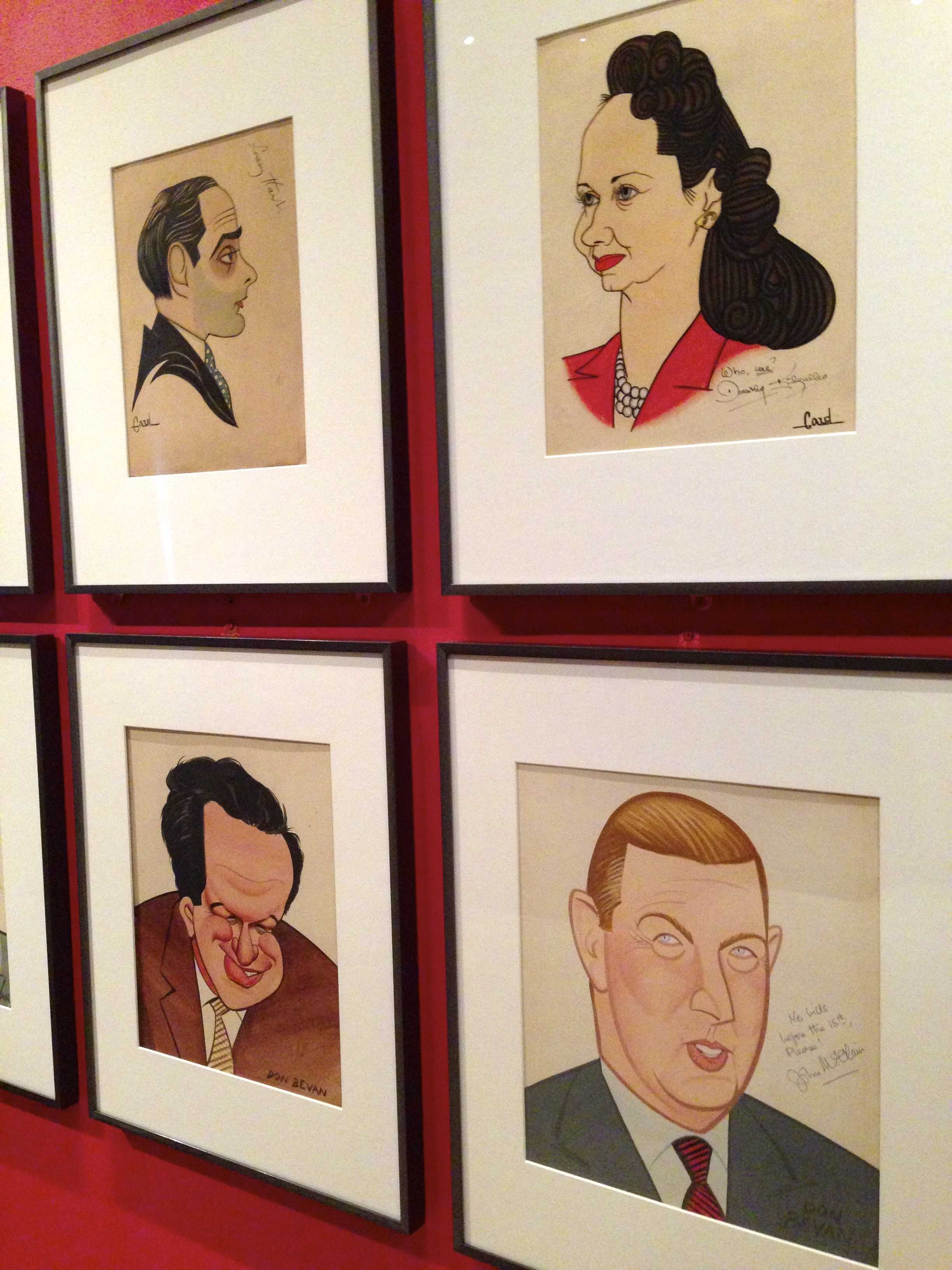 Installation view of Alex Gard’s portraits at Sardi’s – Lorenz Hart, Dorothy Kilgallen, Al Capp, and John McClain. Collection: NYPL
