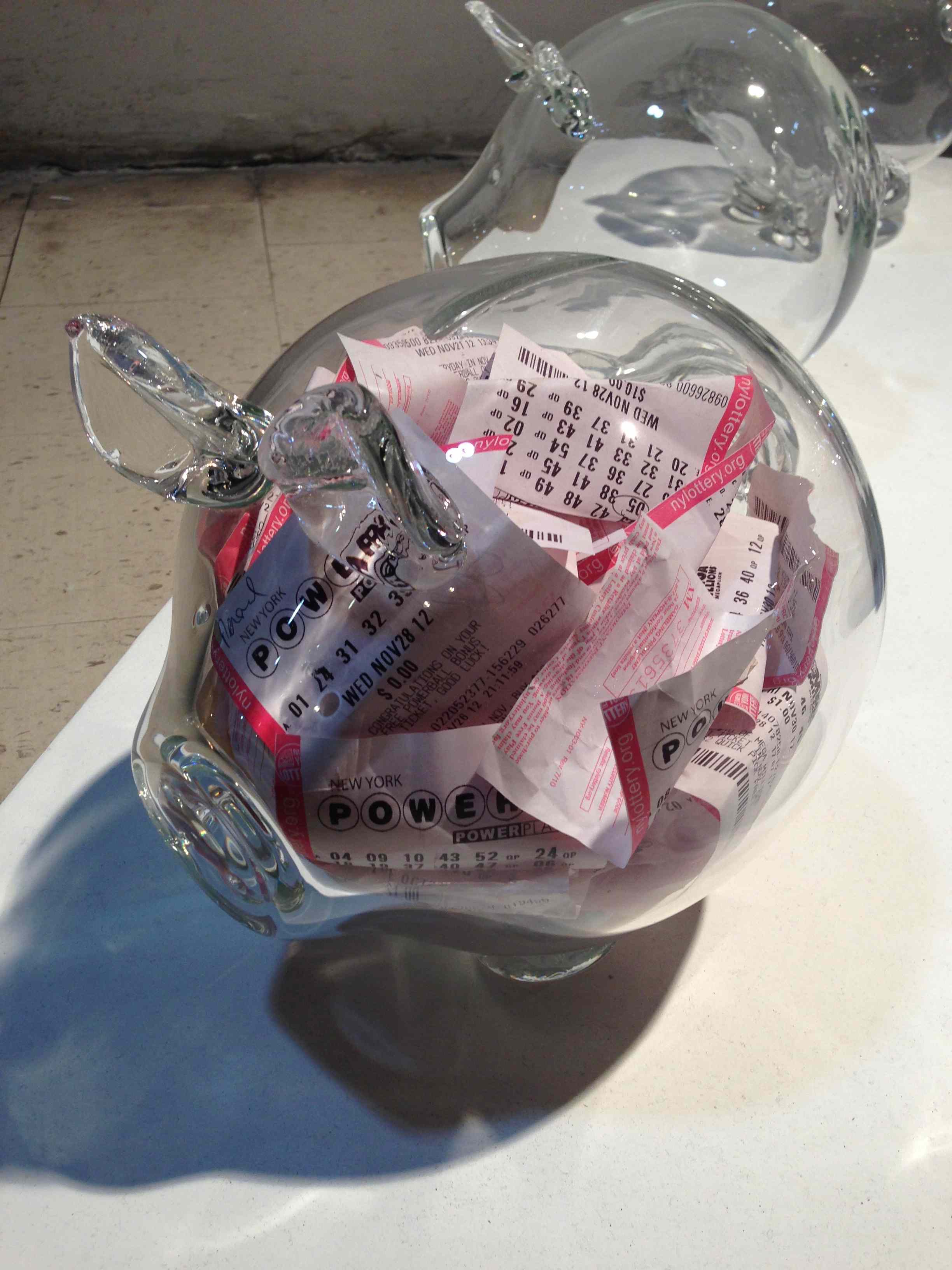 Installation view of Coleen Ford’s Saving for our Future (2012), glass piggy banks stuffed with lottery tickets.