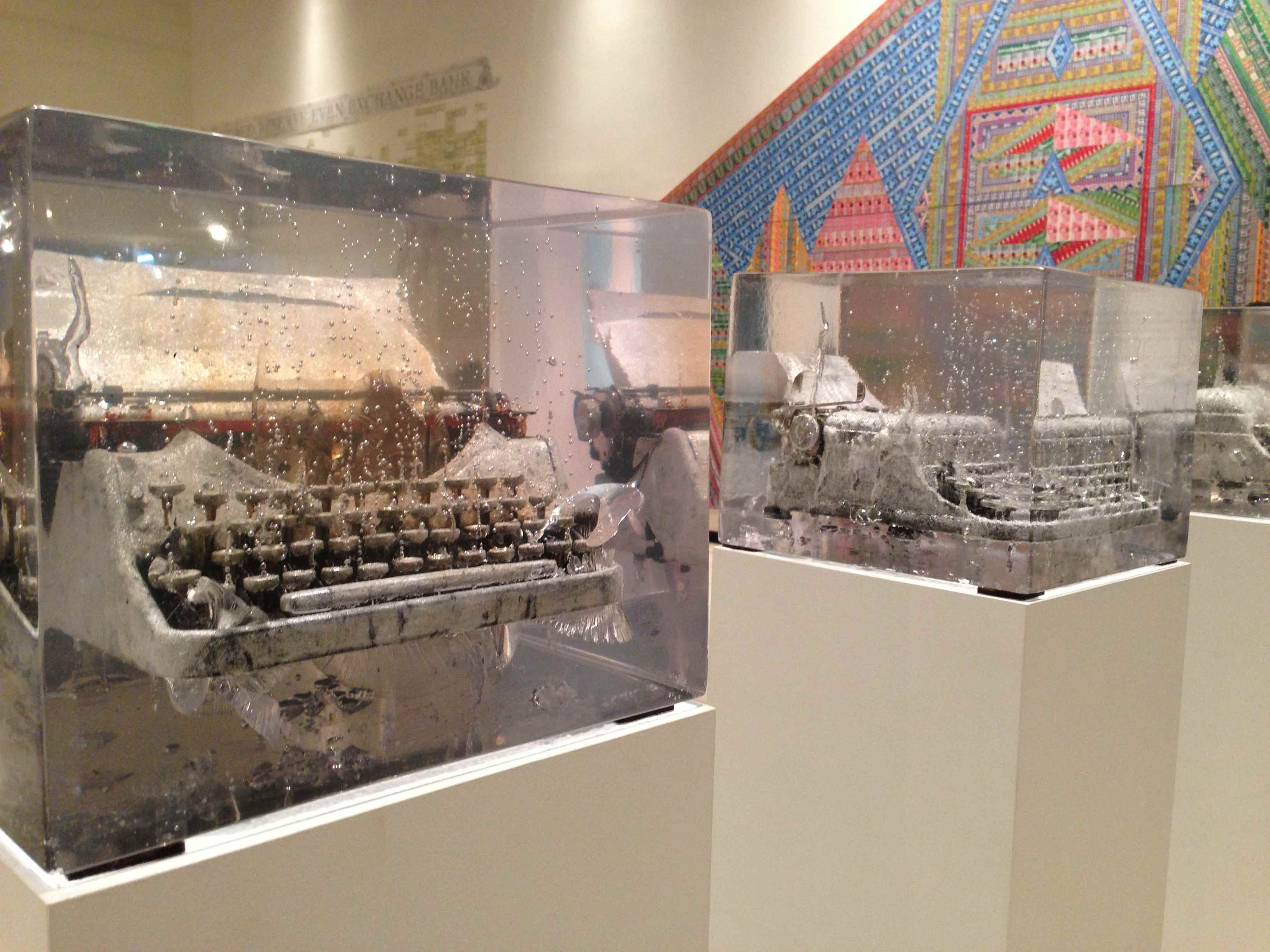 Installation view of Keiko Miyamori’s typewriters-in-resin (2012) with Ghost of a Dream’s The Price of Happiness mural (2011) made from losing US and Chinese lottery tickets.