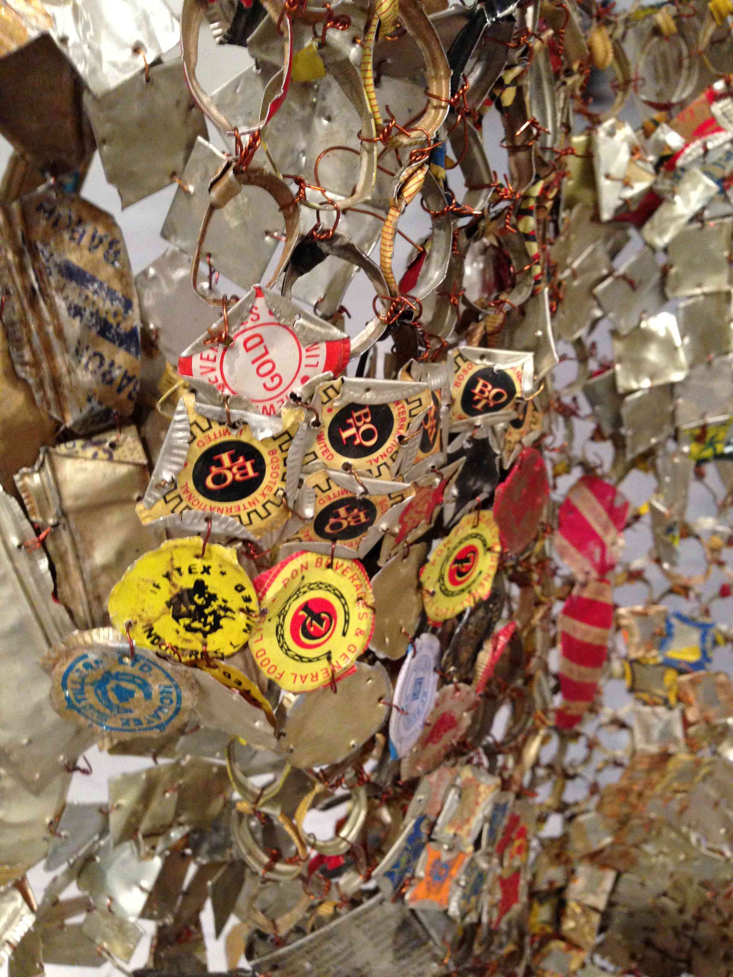 Two more galleries feature other large-scale works, arranged and pinned on walls, bunched like beautiful fabrics. Anatsui creates his gigantic constructions, carefully sorting the different colors of metal from the various brands of beverages. He says it’s like doing a watercolor wash, and when you view the work in person, you’ll be stunned by the variety of color, pattern, and lovingly arranged metal tapestries.