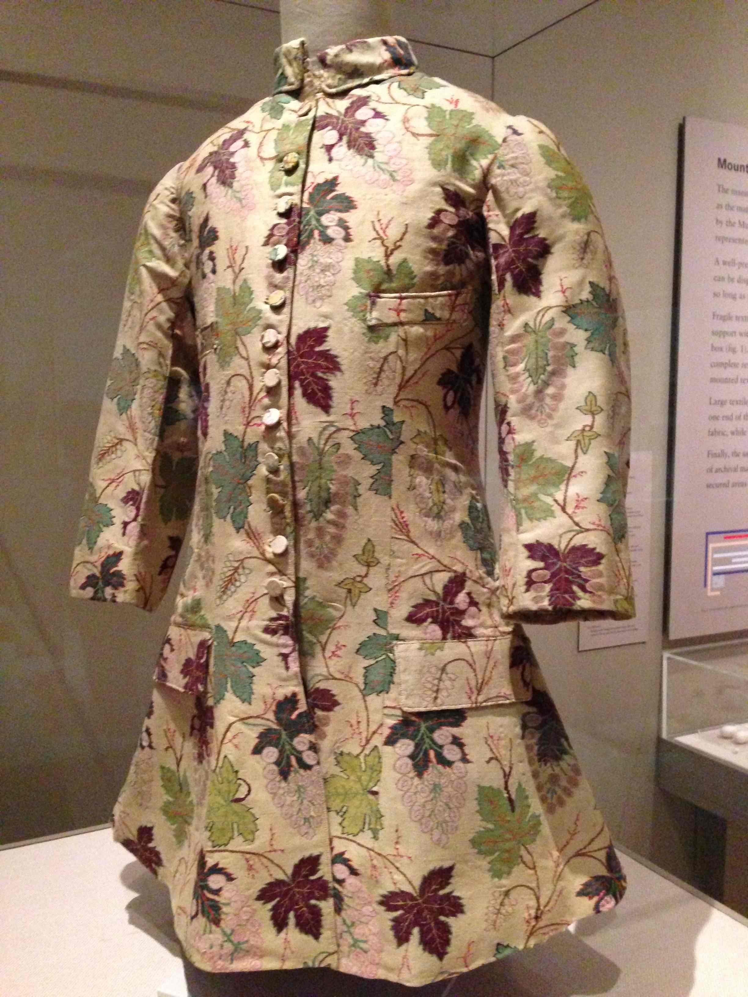 Child’s coat from India on display in the show. Tailored in the late 19th c., but but fabric woven late 18th c. The textile is from Kashmir and is likely pashmina.