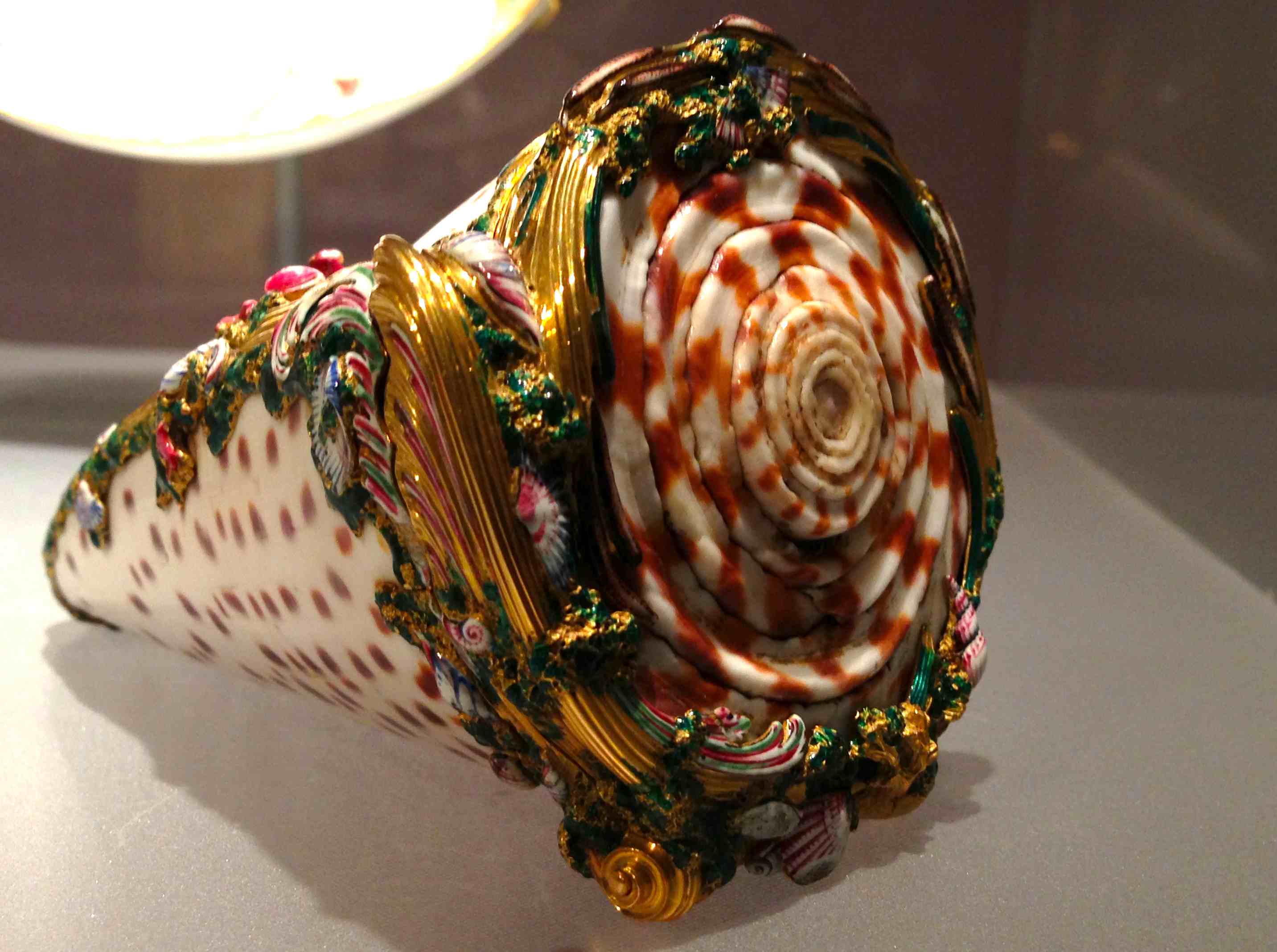 Our vote for best “fancy” object: A beach shell embellished with enamel and gold by Barnabe Sageret around 1745.