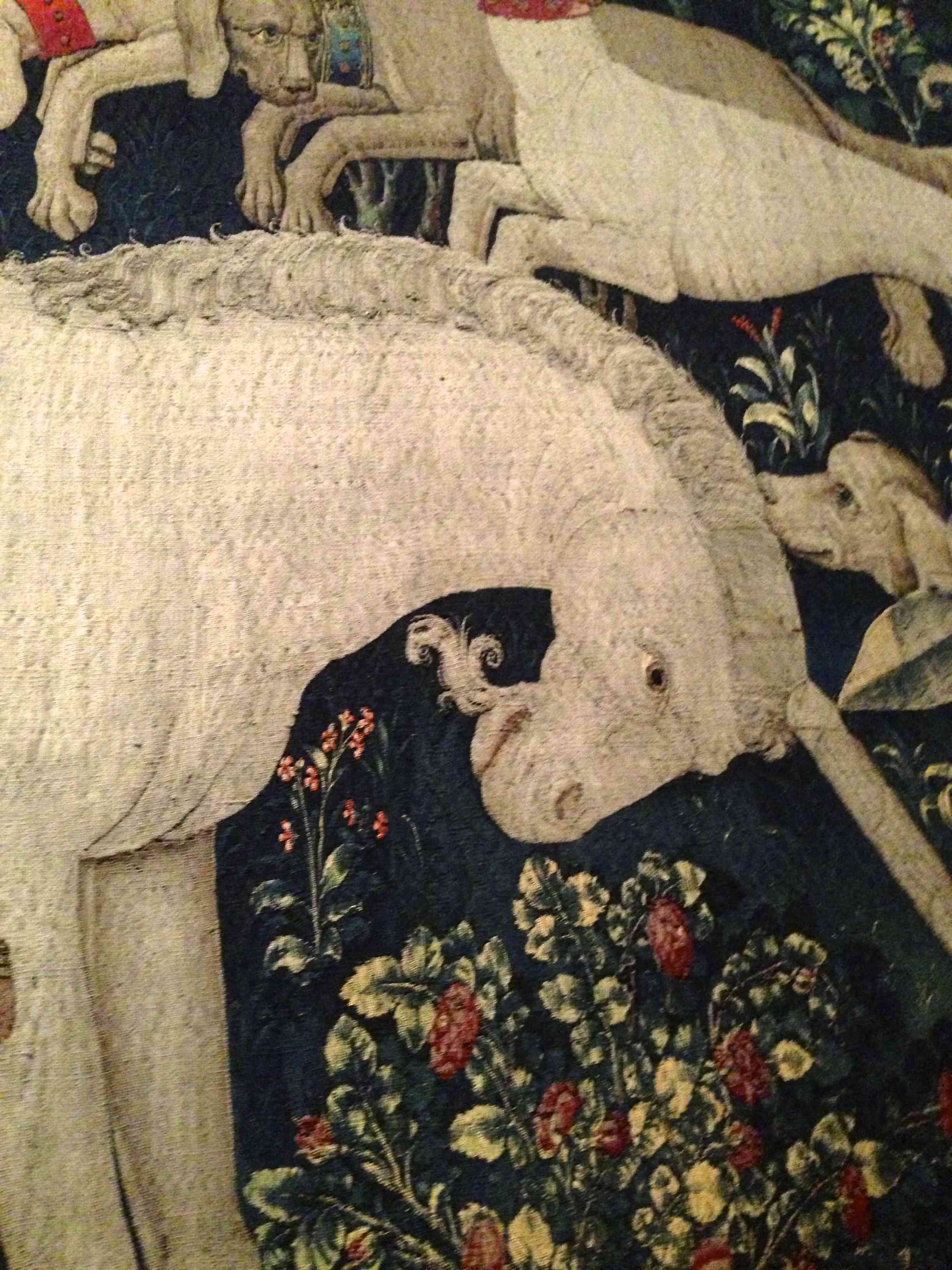 The narwhal’s gracefully shaped, unicorn-looking incisor tooth is given a place in the show, too. One from a private collector is in the Romanesque gallery alongside one of the tapestries, The Unicorn in Captivity (the one in the fenced-in pasture); the second stands behind glass opposite the rest of the tapestries in their usual gallery.
