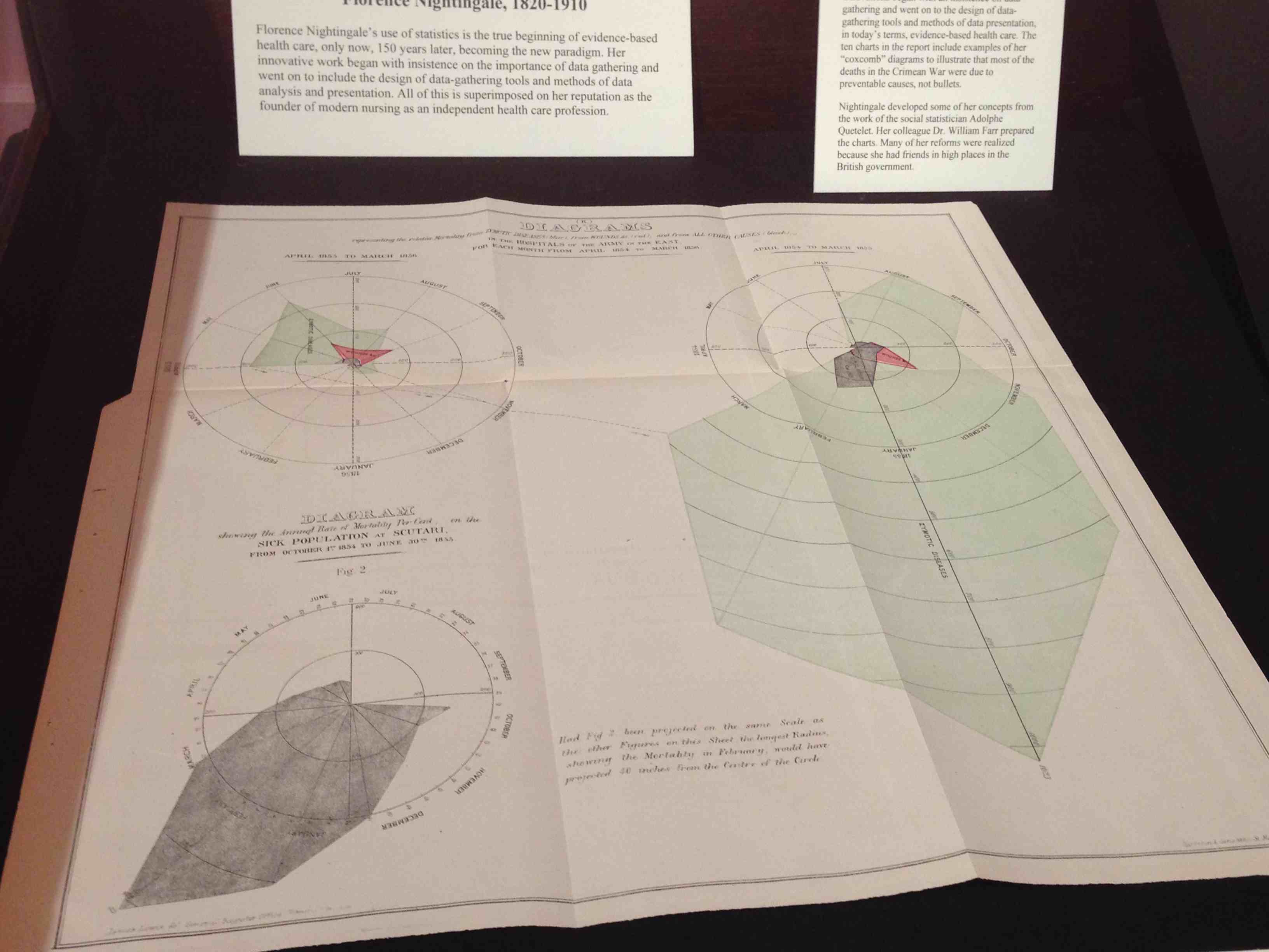 Everybody knows that Florence Nightingale (1820-1910) innovated modern nursing, but the exhibit showcased the fact that she got her ideas across because she was an expert statistician. She used stats to kick-start evidence-based healthcare. Think about it: life before Excel.
