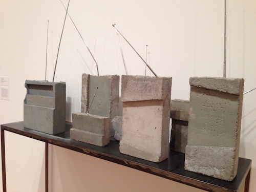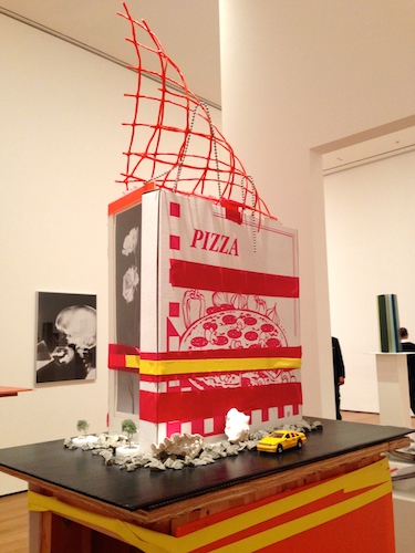 But rather than rely on “substantial” materials to interpret hard-edge Modernist design, she cobbled together vignettes of toy cars, pizza boxes, and other ready-mades holding it all together with brightly colored adhesive tape. (As you walk through her tall plywood stands perusing her cityscapes, watch out for the tiny Hula-Hair-Barbie-wannabe toy standing along the narrow pathway facing the gallery wall.)