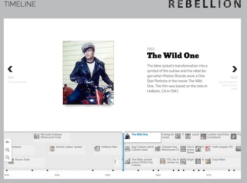 The digital timeline begins with the birth of the motorcycle in the UK in 1902, but the fashion story starts in 1928 with the debut of the leather riding jacket, The Perfecto by the Schott Bros. It’s the template upon which all other cool looks – street, couture, punk, ready-to-wear – are based. It combines the swag of a WWI aviator jackets with the utility and protection needed by one of the original road warriors. Retail: $5.50.