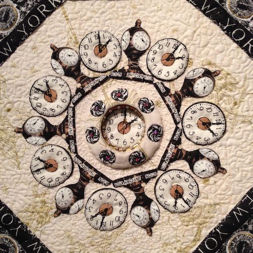 The Grand Prize went to Baltimore’s Amy Krasnarsky, who used Beauty Blocks, sequins and trapunto to evoke the people who have trod those marble floors over the last 100 years. Amy worked in the acorns and oak leaves, which the Vanderbilt family chose to be their symbols and which are embedded in every nook and cranny of the lavish terminal. Once you begin looking, you’ll see them everywhere.