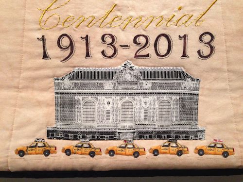 Hudon, Ohio’s Nancy Gary received an Honorable Mention, but achieved something quite unique – simultaneous views of the interior and exterior of GCT. Her quilt accurately conveys the dramatic interior of the terminal and those magnificent windows while also showing us the line-up of taxis along the 42nd Street stand. Everything is where it should be, including the black square on the ceiling – the tiles left by the restoration crew to show just how sooty the interior marble and zodiac ceiling used to be.