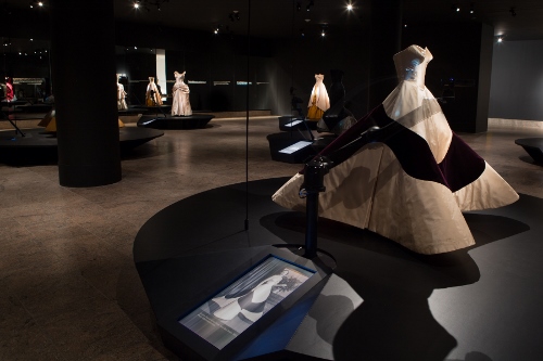 The mirrored walls of the upstairs gallery and the see-through dividers downstairs are emblazoned with the wisdom of the man himself. He seems to be talking right to you as you wonder how he made the fabric do what it’s doing (“It’s the air that’s sculpted, not the silk”) or how he thought about the world of fashion (“We who have been ahead in style have usually been ahead in our thinking”).