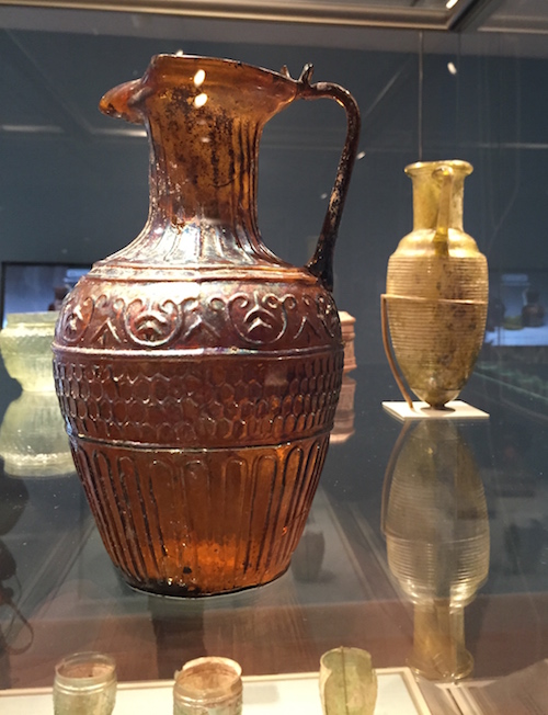 Two identical one-handled Ennion jugs from different sites. On right, the only Ennion piece with an intact foot, 1st c. A.D.