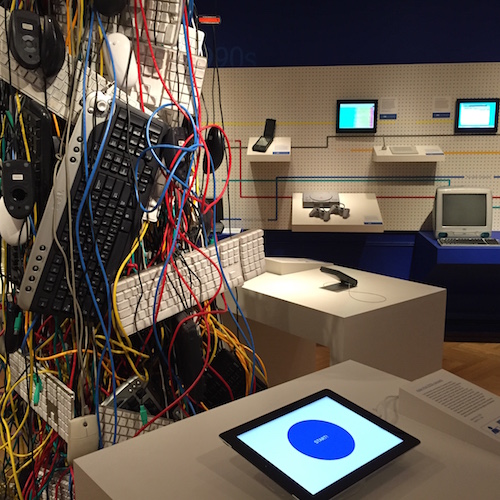 Your first view of the fourth-floor show is a tangled tower of keyboards and cables, surrounded by a pegboard gallery with little platforms displaying the timeline of devices – desktop PCs, tablets, and game consoles.