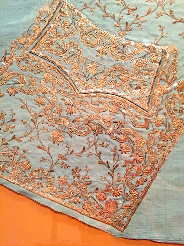 You’ll see swaths of silk or velvet all embroidered to the fit of the customer, just waiting for the tailor to perform the 3D transformation. The handwork is truly incredible. An early sample from the 1760s uses silver (that’s metal) embroidery interlaced with different-sized sequins to catch the light. Just imagine the dazzle when that guy made his entrance at court.