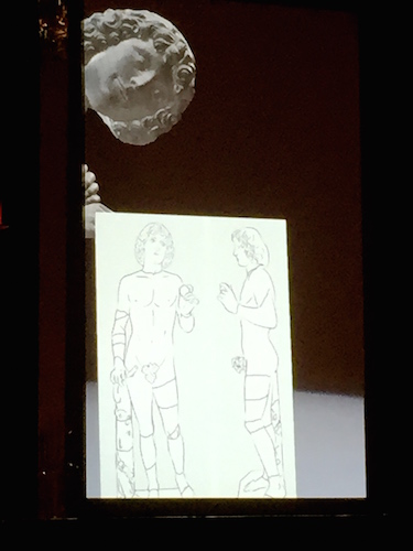 Classical Adam (the marble one) is installed prominently in the gallery where half the performance takes place. Its presence is a miracle, since the beautiful Renaissance sculpture totally shattered in a freak fall in 2002.