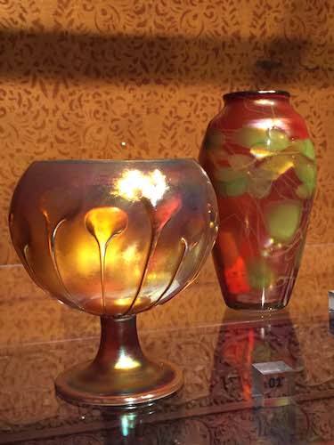 1-1 Tiffany & De Forest Published March 20, 2017 at 375 × 500 in Tiffany Again Illuminates the Carnegie Mansion Tiffany’s 1900 glass goblet and 1899 mold-blown glass vase against De Forest’s stenciled walls of the Teak Room