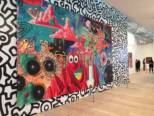 1-1 Fast Forward at Whitney Published May 14, 2017 at 500 × 375 in Fast Forward to the Eighties at The Whitney Kenny Scharf’s When the Worlds Collide, 1984, hung against a pattern based on Keith Haring’s 1986 Pop Shop mural