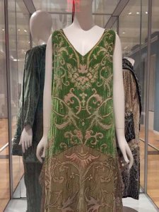Clothing plays a role in the show, but the displays include more accessories and jewels. Beautiful evening dresses by Chanel and Callot Soeurs are featured, along with a pair of exquisitely preserved sparkly dancing shoes and a modern knit bathing suit that really revealed all of a woman’s curves.