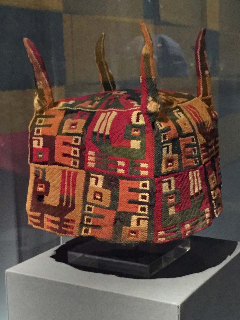 1-18 Golden Kingdoms at The Met Published May 24, 2018 at 1224 × 1632 in Gold and Other Ancient Luxuries at The Met Knotted woven crown made in one piece from either Peru or Bolivia (Tiwanaku or Wari), 500 – 900 A.D. Collection: the Met