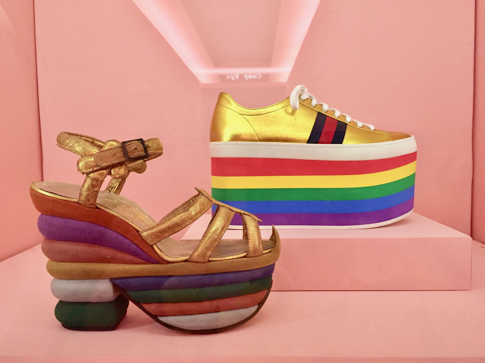 1-27 Camp at The Met Published September 6, 2019 at 1622 × 1216 in The Met’s Deep Dive Under the Surface of Camp Fashion Judy Garland’s 1938 Ferragamo sandals and 2018 resort shoes by Alessandro Michele for Gucci.