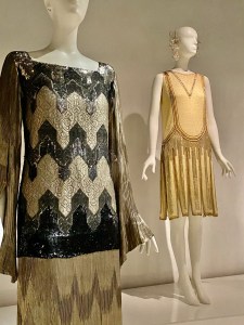 1925 lame and lace dress by Paul Poiret and 1925-28 evening dress with paillettes, beads, and crystals