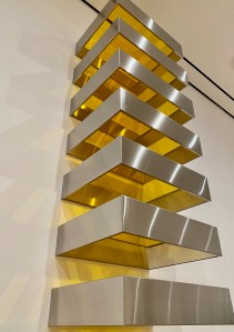 Towers emerge from walls in each room – neat stacks of monumental rectangles, separated by exact amounts of space. It’s quite a sensation to approach one, look up, and feel its commanding presence. One silver tower seems to be emitting yellow light. A copper tower gleams a little from a subtle spotlight.