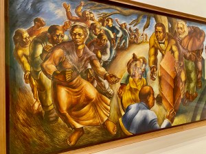 But just beyond, you’ll glimpse galleries that promise deeper stories of emotional, turbulent, modernist angst. A half-scale reproduction of Orozco’s mythic Prometheus mural occupies an alcove, surrounded by works by artists he inspired –Jacob Lawrence’s pictorial history of African-American northern migration in 1910-1940 and Jackson Pollack’s early Thirties paintings that channel Orozco’s depiction of writhing life forces.