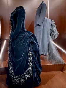 Stepping into the first gallery, sixty black dresses are arranged like minutes on a clock. The exhibition begins with an example from 1870, the year that the Met was founded, and progresses in time from there.  At each point, you see an ensemble from that year, paired with a designer look from a different year that echoes it – bustles, princess lines, gigot sleeves, tailored jackets, flourishes of 18th-century aristocratic opulence.