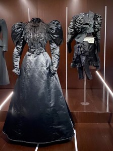 The 19th century garments are solid black, with masterful tailoring, swags, trims, and embellishments. In a tribute to the home town, two were created in Brooklyn: the 1885 silk satin dinner dress by Mrs. Arnold (paired with Rei Kawakubo’s equally elaborate but deconstructed 2004 ensemble) and an 1897 riding habit from Brooklyn’s acclaimed department store, Frederick Loeser & Co. (paired with a 1968 equestrian-style suit by Victor Joris).