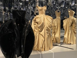 The displays follow the same convention – sequential years paired with a “disrupter” dress or ensemble – but the impact is enormously disorienting, since the “twin” piece could be from the past or future and the mirrored walls and ceiling turn the experience into something like Kusama’s “infinity” room.