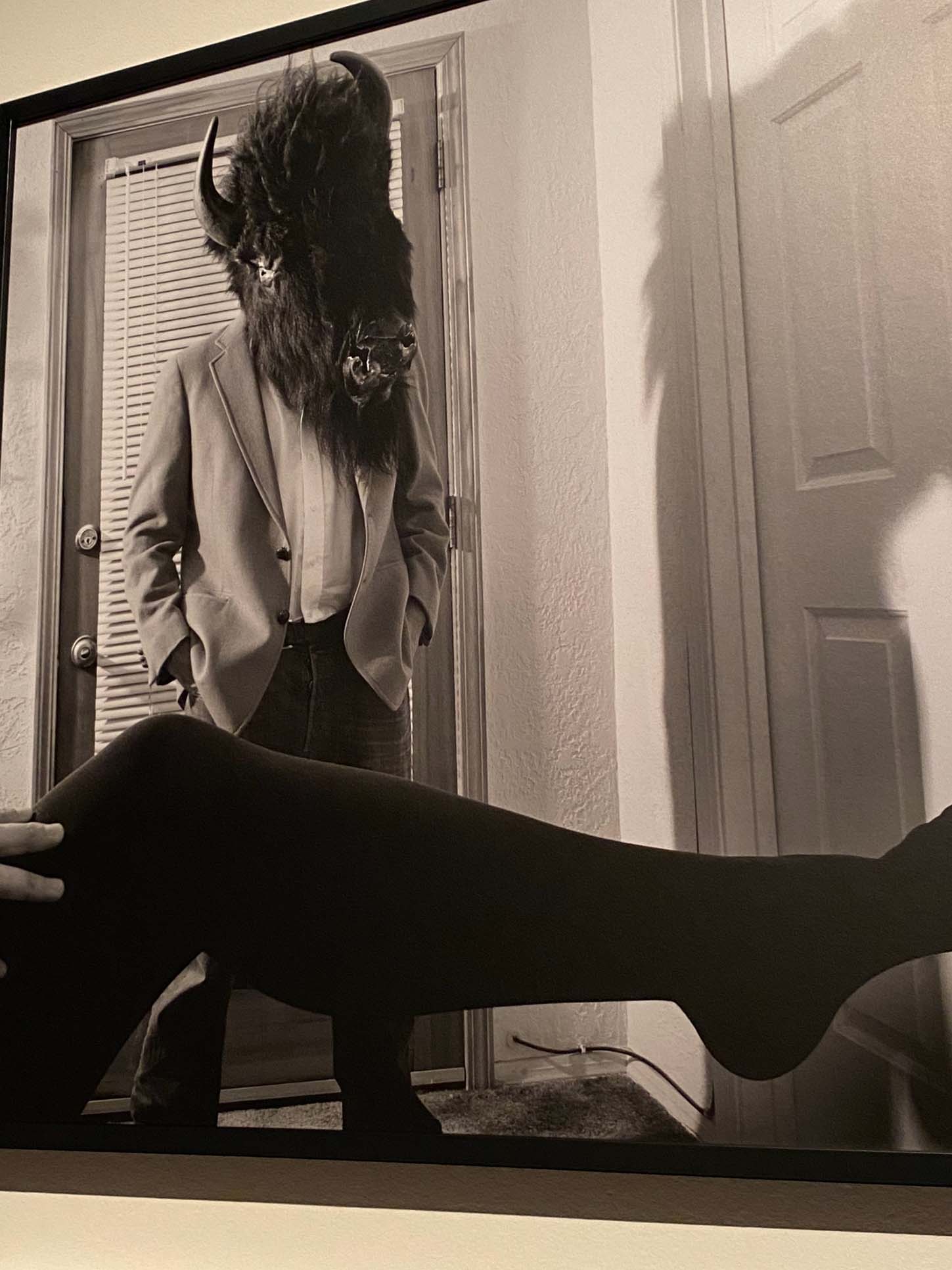 Amerman’s alter ego, Buffalo Man, features prominently in the show, particularly in his collaborations with acclaimed photographer Cara Romero, where icons of Native culture insert themselves into American pop culture.
