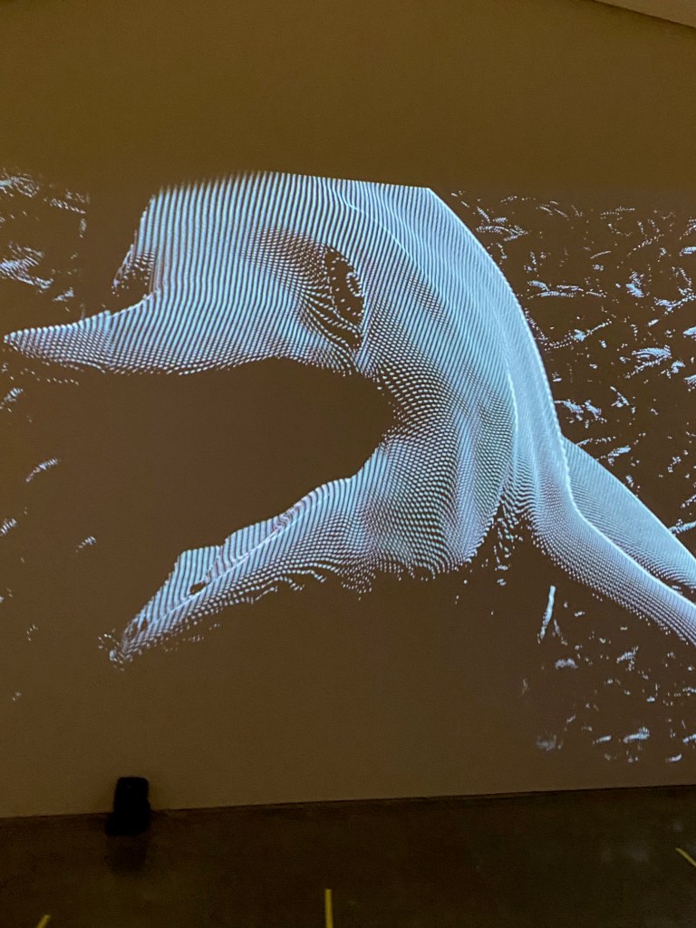 The most dramatic spectacle is on the far wall – a life-sized animated recreation of these gigantic swimming creatures by artist Ivan Cruz in collaboration with paleontologist Martin Sander and exhibition designer Nik Hafermaas. From the inky blackness, thousands of points of light emerge, float across the long wall, and coalesce into 3-D sea creatures that appear to swim across the entire length of the room.