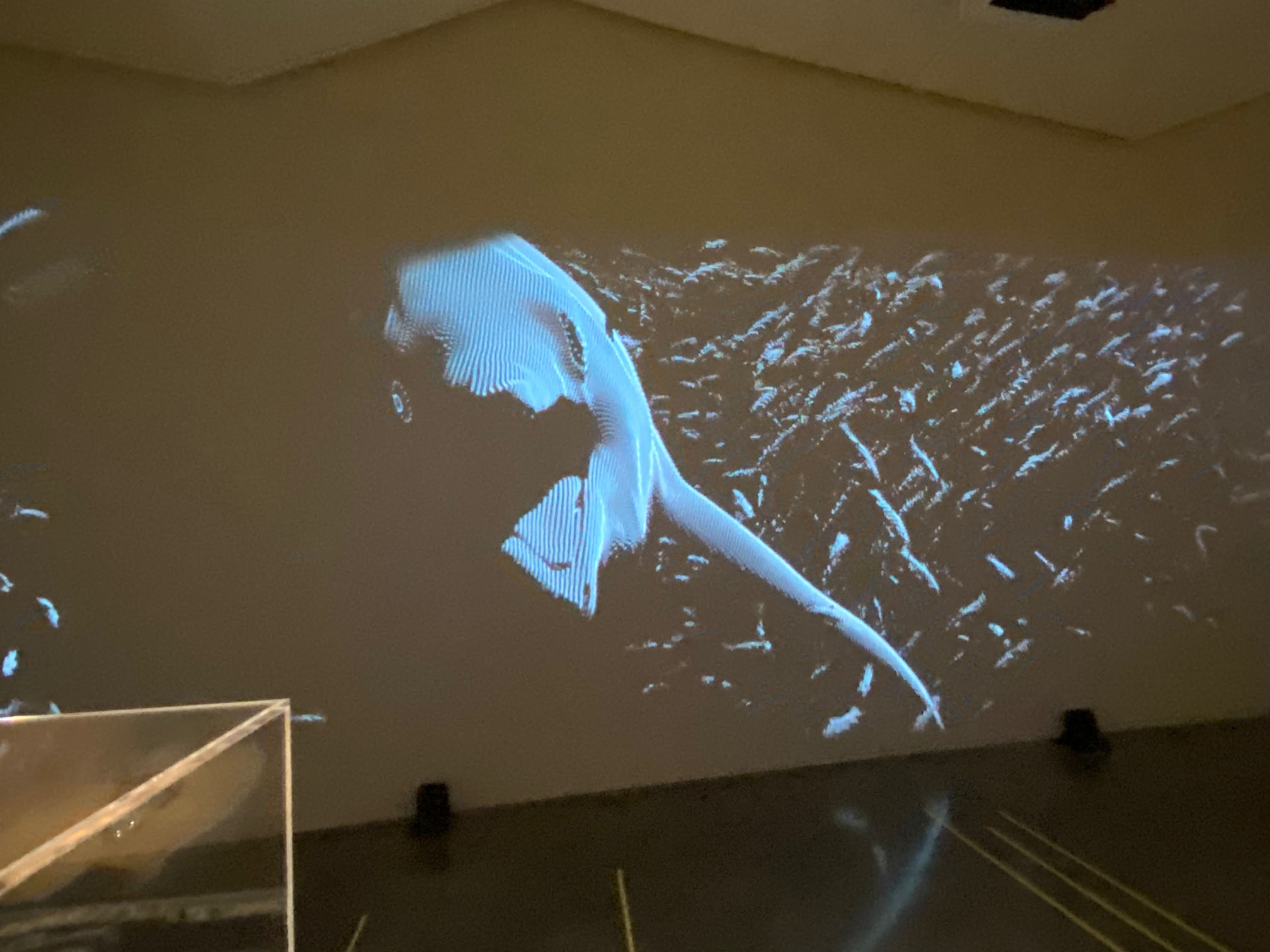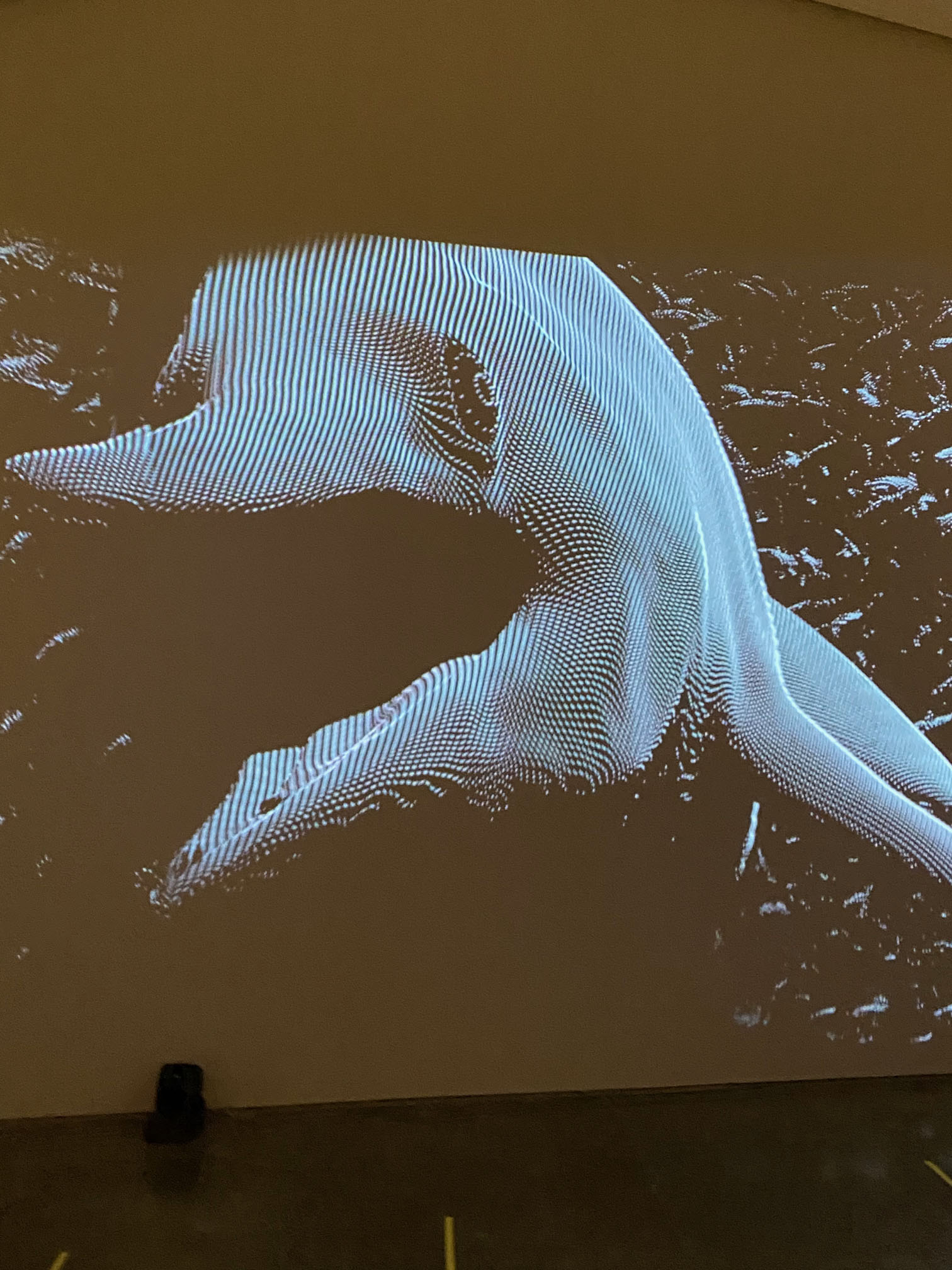 The most dramatic spectacle is on the far wall – a life-sized animated recreation of these gigantic swimming creatures by artist Ivan Cruz in collaboration with paleontologist Martin Sander and exhibition designer Nik Hafermaas. From the inky blackness, thousands of points of light emerge, float across the long wall, and coalesce into 3-D sea creatures that appear to swim across the entire length of the room.