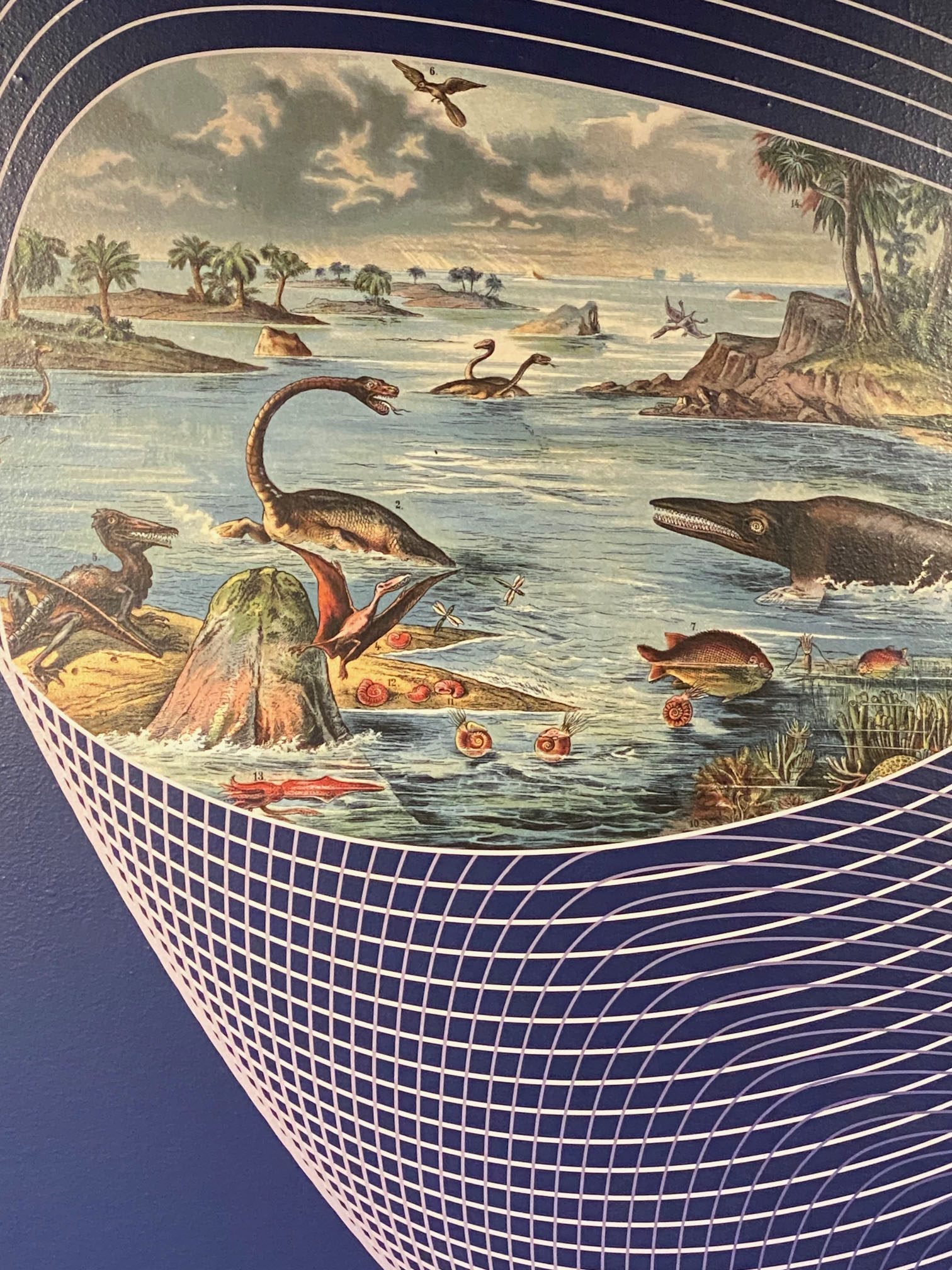 The exhibition includes a whimsical corridor leading to images from 19th-century paleo art and to vintage toys from a dinosaur and prehistoric-animal collector. The final room is a kaleidoscope of nostalgia – images from Europe’s earliest prehistoric ecosystem recreations to dinosaur collectibles from Chicago’s 1934 Century of Progress Fair.