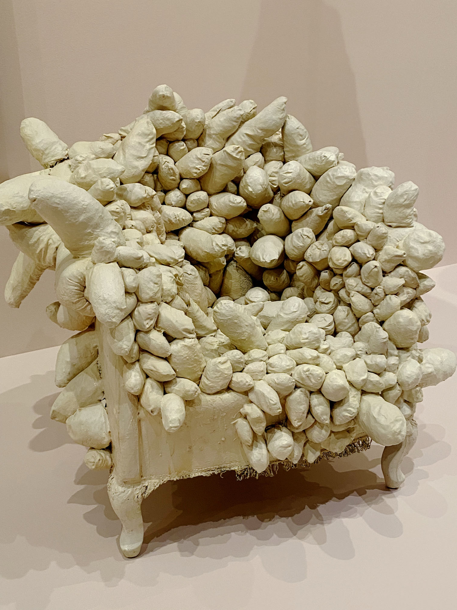 Another section presents work – many from repurposed or recycled material – with sensuous forms that suggest – but not directly depict – the human body. It’s nice to see such an array of soft, draped, and biomorphic work by artists like Kusama, Eva Hesse, Kay Segimachi, and nearly forgotten Miyoko Ito.