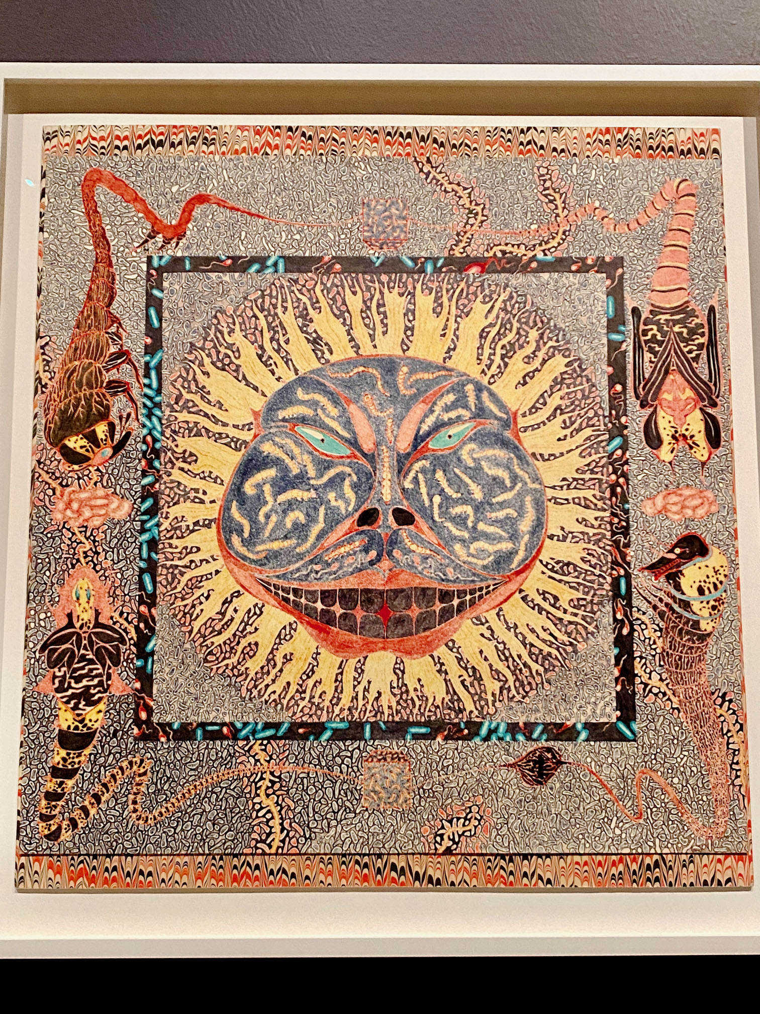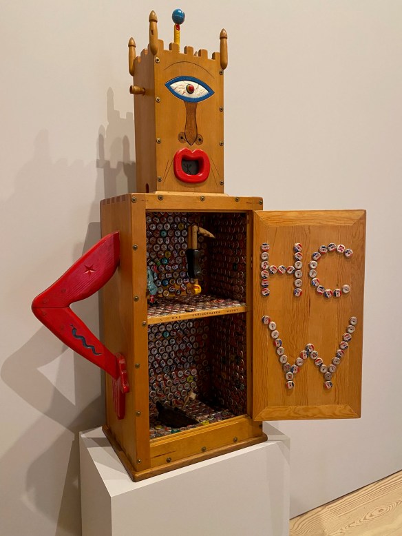 The Whitney’s chosen to showcase several pieces of one of the artistic godfathers of the funk movement – H.C. Westerman. His satiric “minimalistic” shag carpet sculpture sits next to a William T. Wiley painting, but it’s wonderful to contemplate two virtuoso carved pieces – The Big Change and Memorial to the Idea of Man If He Was an Idea.