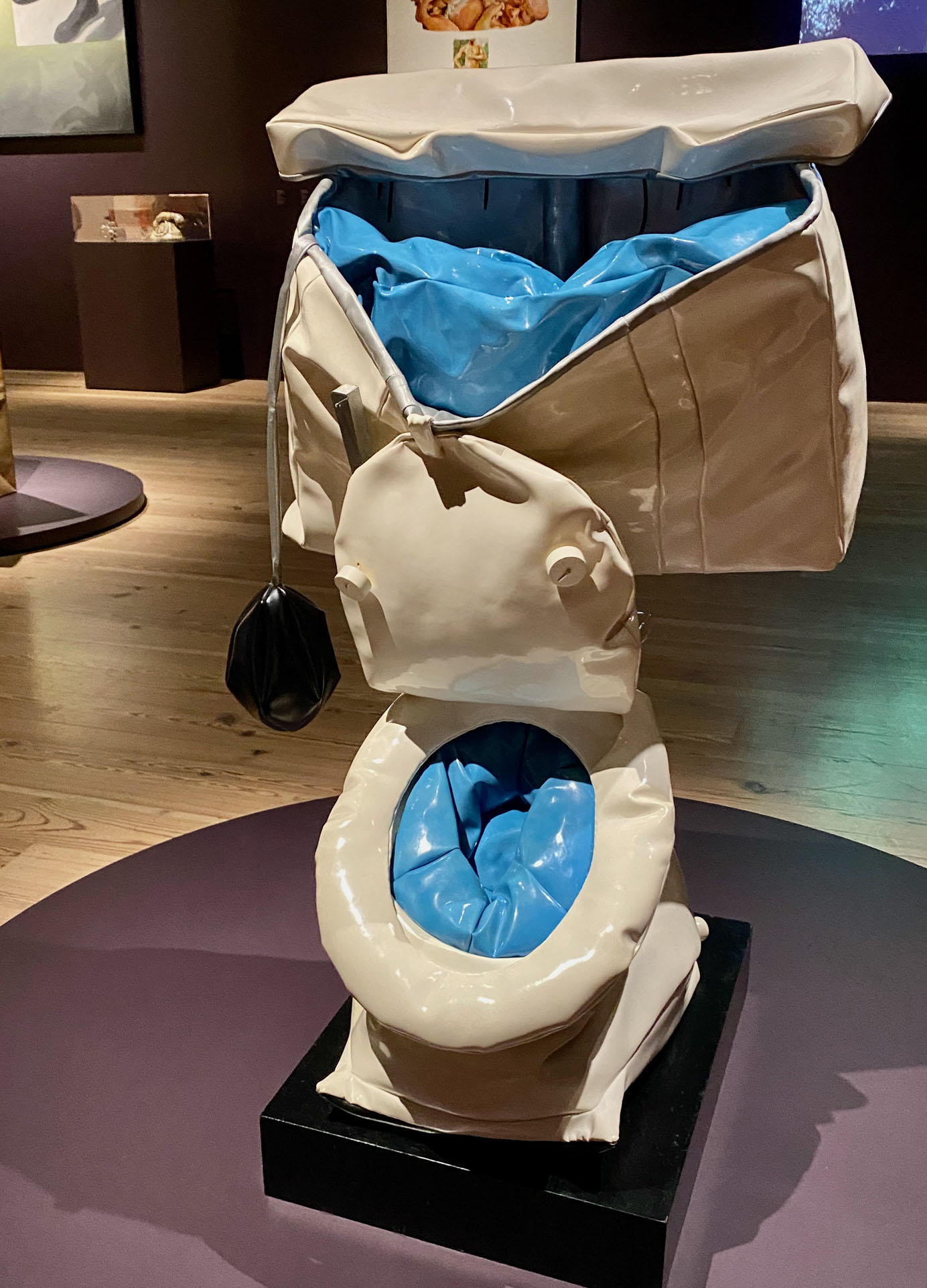 The first gallery presents disquieting creations that present strange, out-of-context juxtapositions, weird images, and out-of-proportion everyday objects that seem to reflect the feeling that we’re living in an off-kilter world. A large Rosenquist hovers over the gallery, but its muted tones and dissonant images evoke a far different mood than his famous, epic, over-the-top F-111.