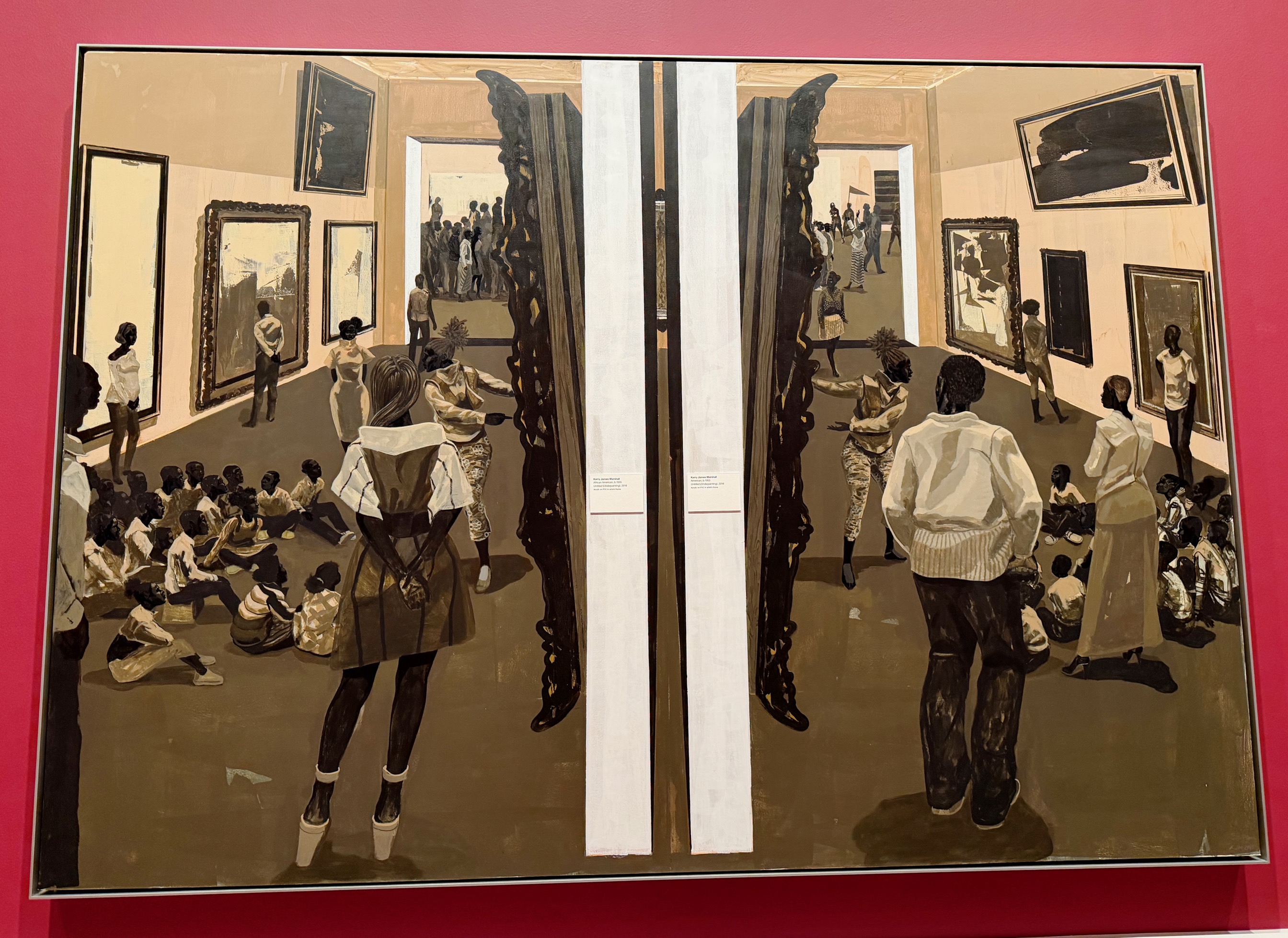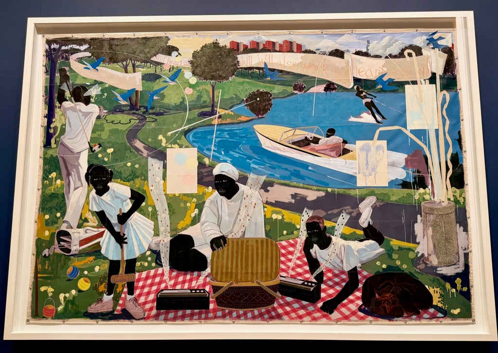 Most of these scenes are presented on a large scale and jam-packed with art-historical, literary, and world-history references. In The Painting of Modern Life-themed gallery, his grand Past Times certainly evokes Parisian leisure-class epics by Manet and the Post-Impressionists. Marshall’s twist is to depict a wholesome, all-white-clad Black family enjoying its picnic lunch lakeside as music and lyrics by The Temptations and Snoop Dogg (literally) drift up from the radios to ask if this is “just my imagination.”