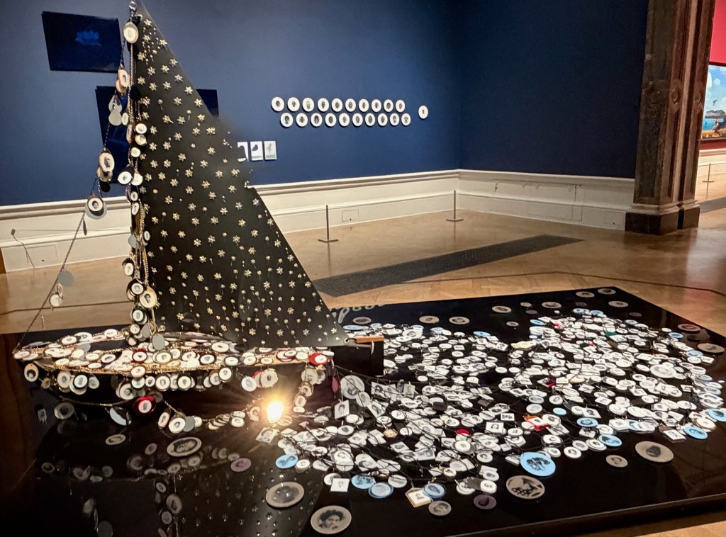 Visitors linger quietly in one of the last galleries devoted to Marshall’s installation at the 2003 Venice Bienniale. Most circumnavigate the sailing ship to get a better look at the hundreds with African-American achievement medals that are scattered about it. They also take close, respectful looks at each of the the commemorative ceramic plates that Marshall created with invented portraits of the first enslaved Africans brought to America.