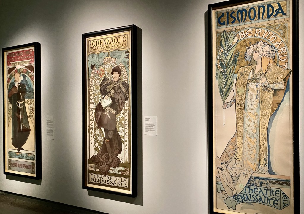 A star framed by a halo: years of Mucha’s poster ads for Sarah Bernhardt’s 1894-1899 plays – Hamlet, Lorenzaccio, and Gismonda. Courtesy: Mucha Foundation.
