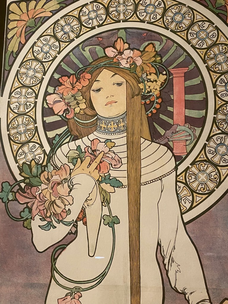 Close-up of Mucha’s life-size 1894 poster of Sarah Bernhardt starring in Gismonda featuring a Byzantine mosaic, Orothodox cross, and Slavic designs. Courtesy: Mucha Foundation.