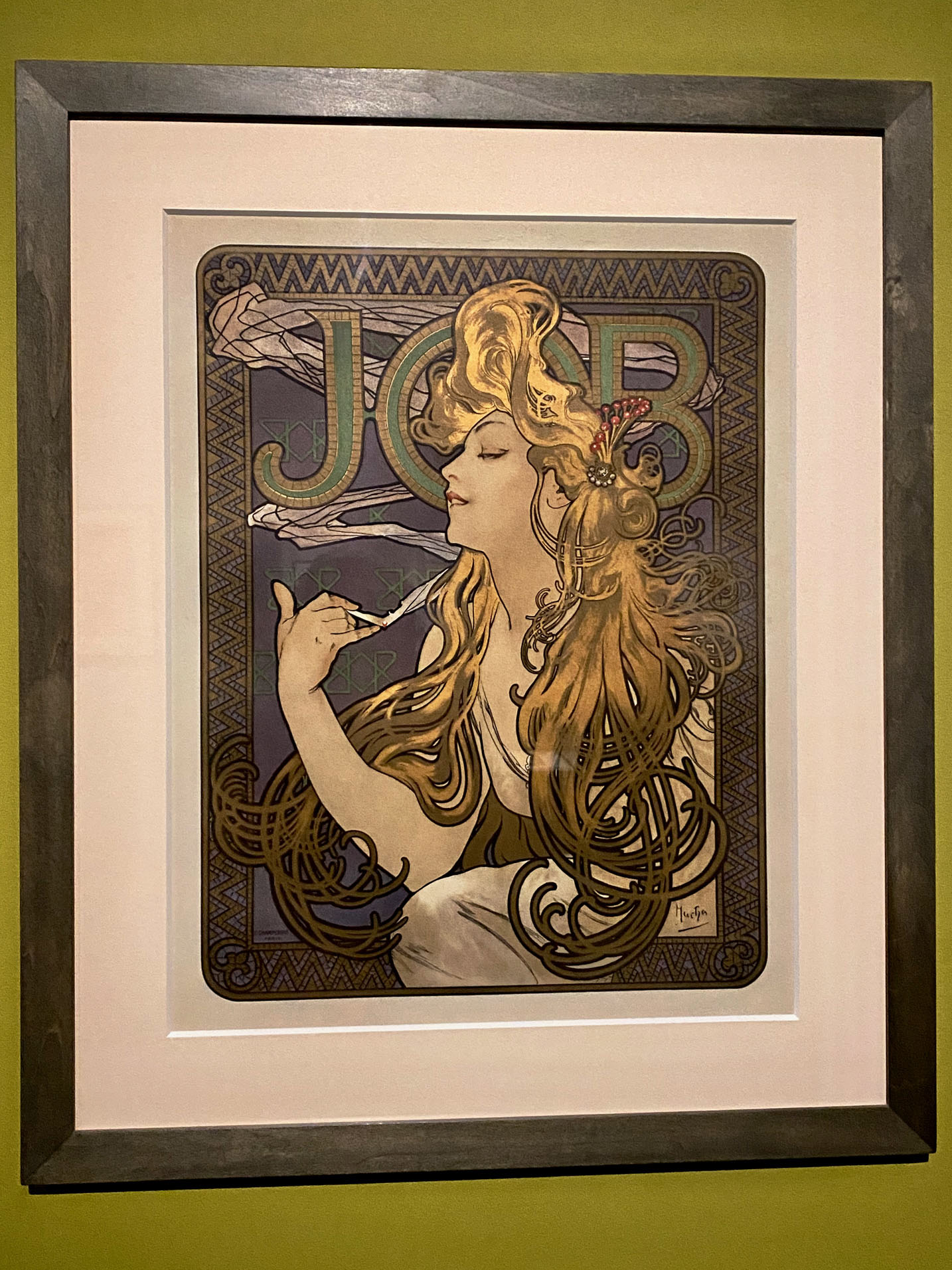 Mucha’s first product advertising poster – 1896 promo for JOB rolling papers featuring a sensuous smoker and a Byzantine border. Courtesy: Mucha Foundation.