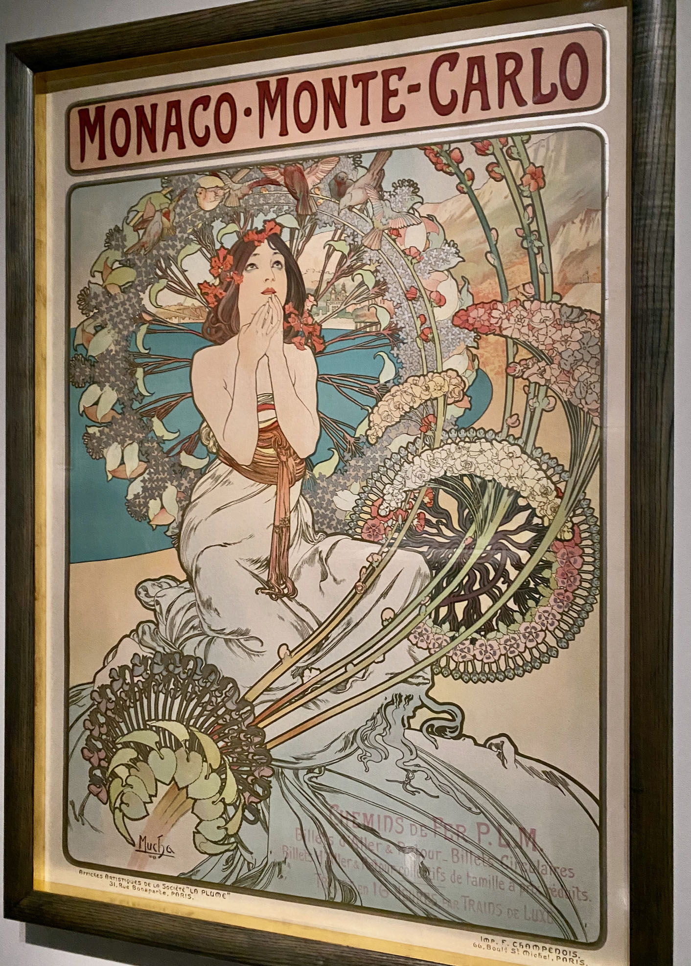 Mucha’s 1897 lithograph Monaco – Monte Carlo, an ad for the Paris- Côte d’Azur railway featuring a young woman dreaming about her beach trip. Courtesy: Mucha Foundation.