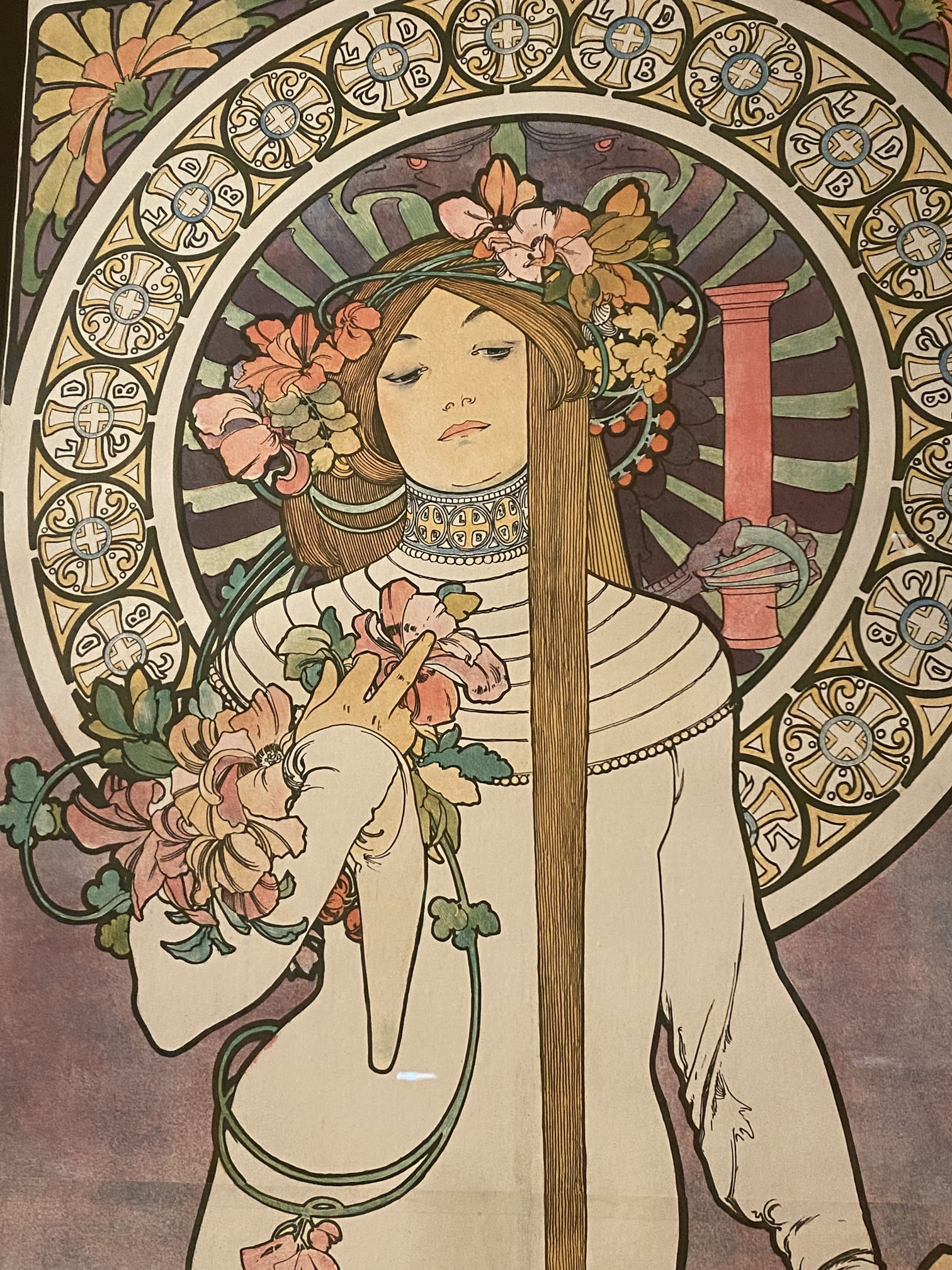 Close-up of Mucha’s life-size 1894 poster of Sarah Bernhardt starring in Gismonda featuring a Byzantine mosaic, Orothodox cross, and Slavic designs. Courtesy: Mucha Foundation.