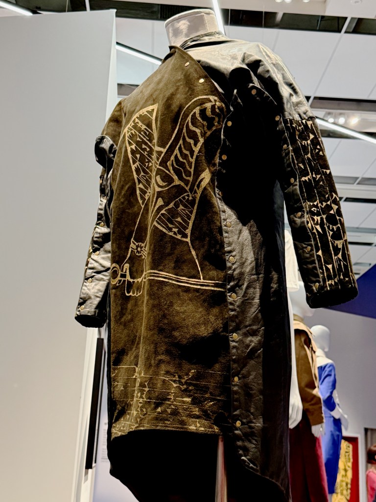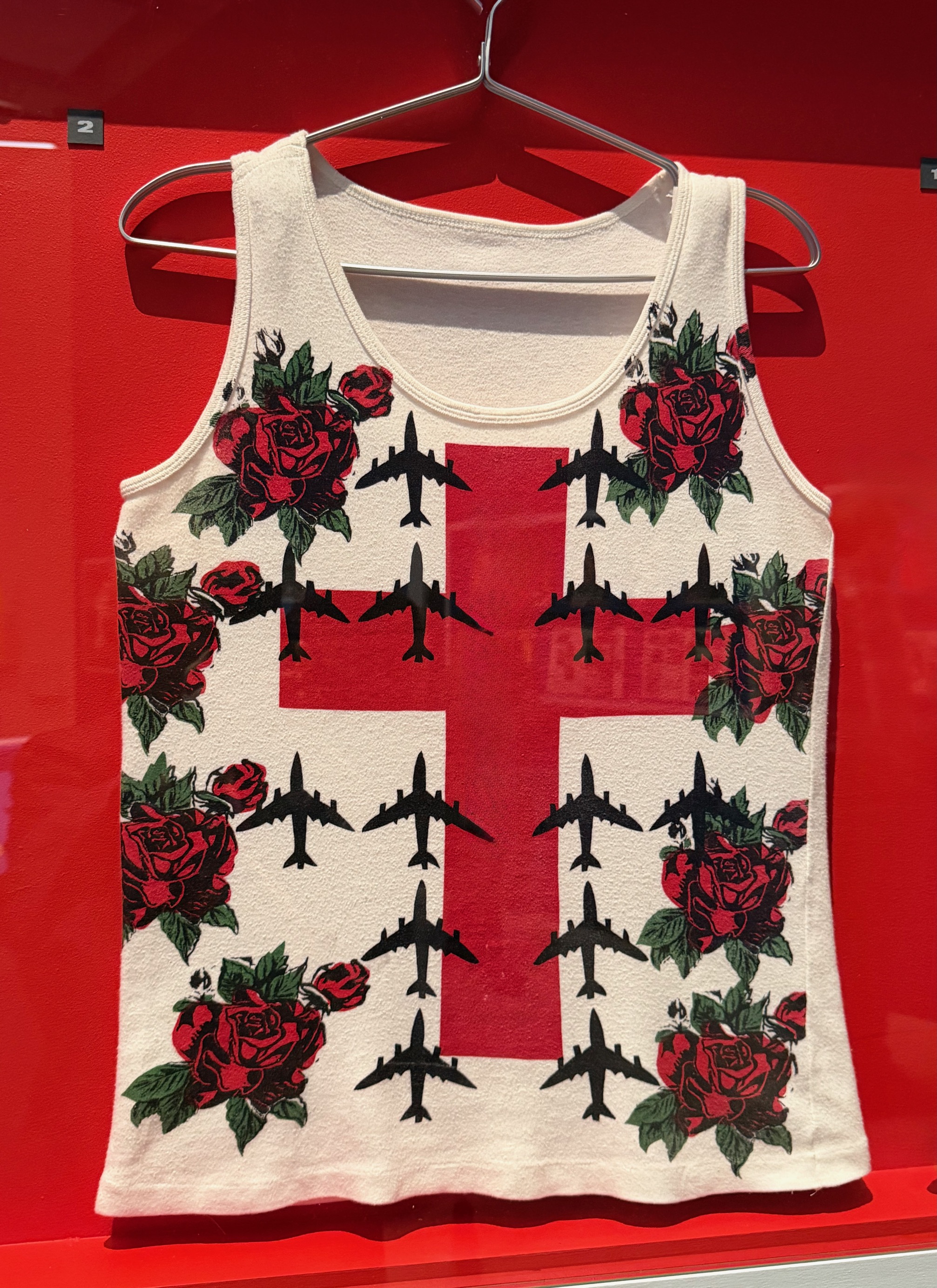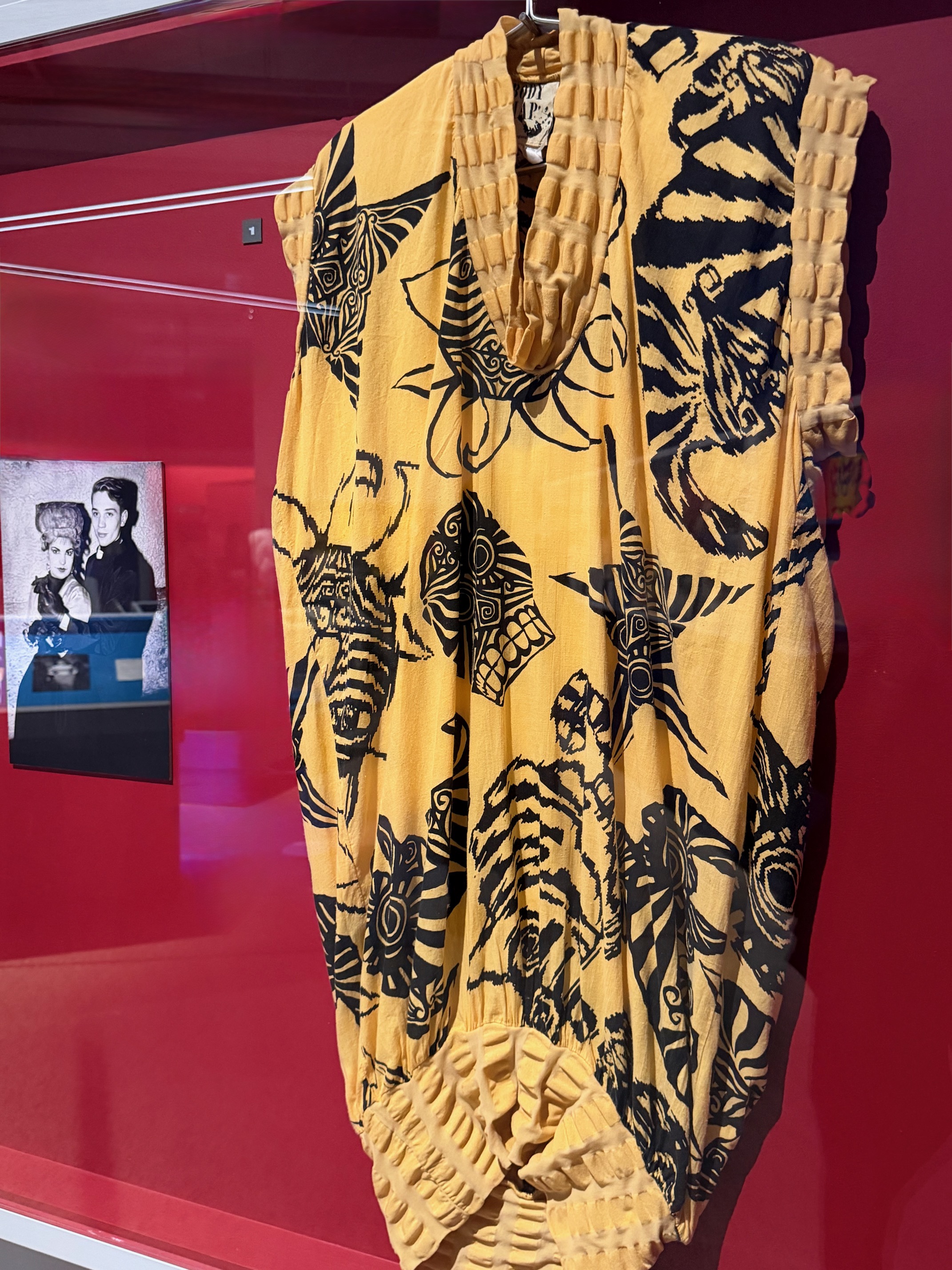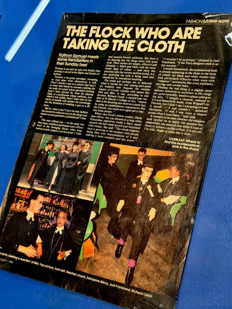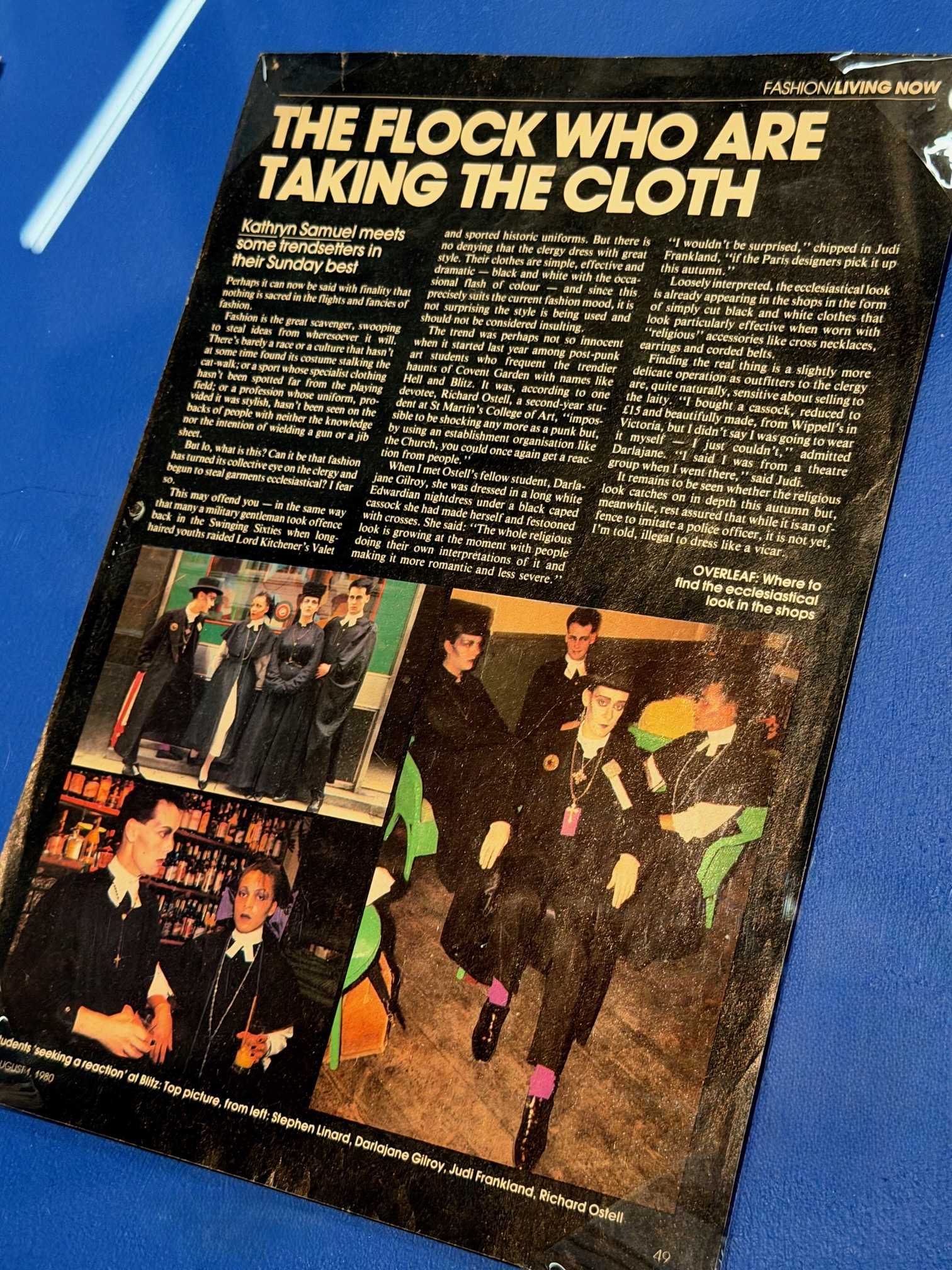 The exhibition shows off many of the designers who defined the ever-evolving look of (what the press called) “The New Romantics.” Backless leather dresses by Fiona Dealey, retro zoot suits by Chris Sullivan, ecclesiastical-inspired unisex garb by Darla-Jane Gilroy, and socio-political tank-top commentary by Sue Clowes. After their graduation collections, many of them sold clothes at Camden Market or specialty boutiques near the club. Their careers were off and running.