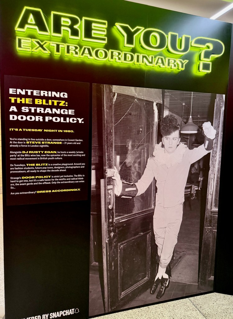 The exhibition recreates the convergence of everything cool in London culture circa 1979-1980. Visitors stand before posters, walls of photos, and fashion recollecting their own experiences at the Tuesday-night wine-bar “private party” where Steve Strange and DJ Rusty Eagan presided over bare-bones space that came alive with color, outrageous fashion, and ginormous personalities. Steve worked the door and (for a nano-second) Boy George ran the coat room. No one repeated outfits.