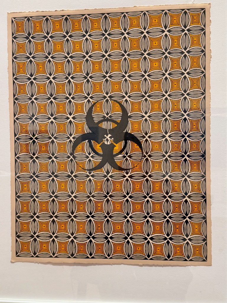 Rowan Harrison’s intricate drawings are made to raise awarness of intergenerational health challenges and to honor and support to cancer victims. The curators have given lots of space to Diné artist Shayla Blatchford’s photo-interview Anti-Uranium Mapping Project, including a sobering map of the nearly 500 abandoned uranium mines scattered across her homeland. Biologist-artist-public health advocate Mallery Quetawki (Zuni Pueblo), creates abstracted works. Only when you get close do you see the shapes are radiation symbols of uranium contamination working its way into DNA strands.